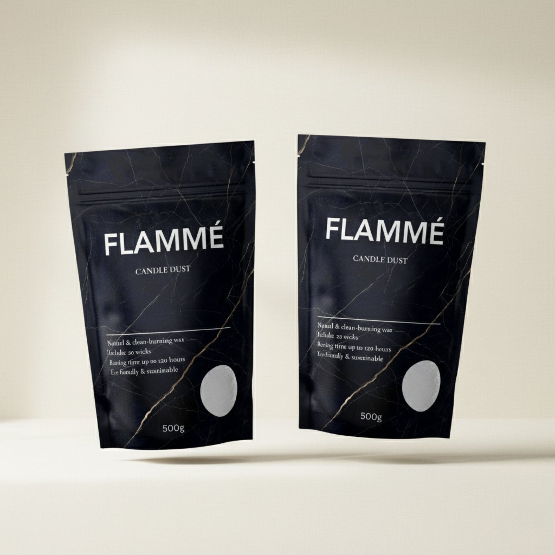 2 × 500g Bags of FLAMMÉ Candle Dust - Clean-burning, sustainable, and reusable. Each bag includes 20 cotton wicks.